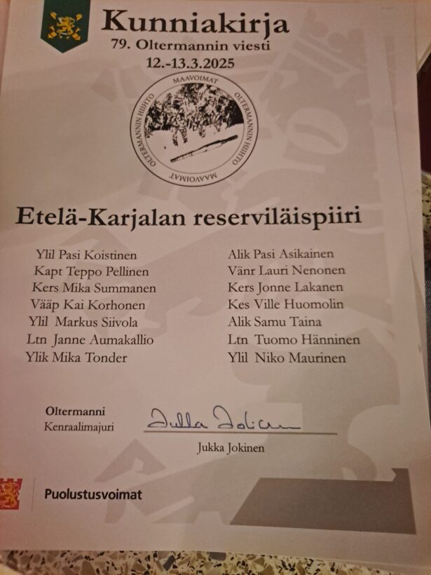 Kymenlaakson reserviläispiiri voitti tämän vuoden Oltermannin hiihdon ja sai ensimmäisenä viestinsä perille Oltermannille, joka on tänä vuonna Maavoimien esikuntapäällikkö, kenraalimajuri Jukka Jokinen. Kymenlaakso oli ainut joukkue, joka alitti kokonaisajassa yhdeksän tuntia. Joukkue kilpaili reserviläissarjassa eli B-sarjassa, mutta se voitti kokonaisajassa noin varttitunnin myös parhaan A-sarjan joukkueen, Kaartin Jääkärirykmentin. A-sarjassa kilpailevat Maavoimien varusmieskoulutusta antavat joukko-osastot.