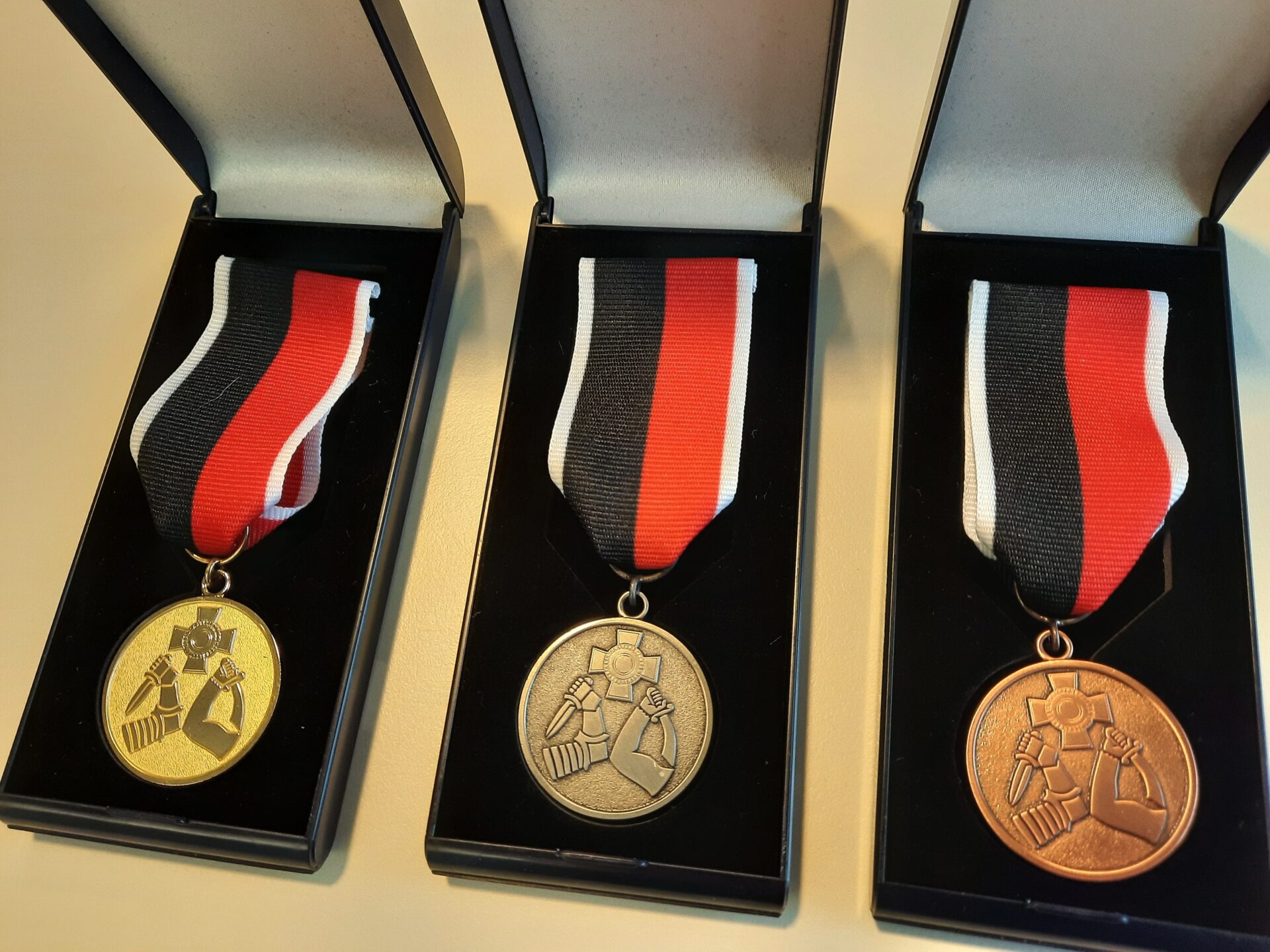 Etelä-Karjalan reserviläispiirin uudet ansiomerkit: kultainen, hopeinen ja pronssinen.