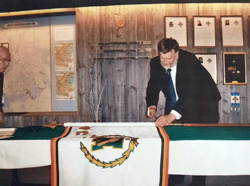 Yhdistyksen puheenjohtaja Markku Hyppönen naulaamassa lippua.